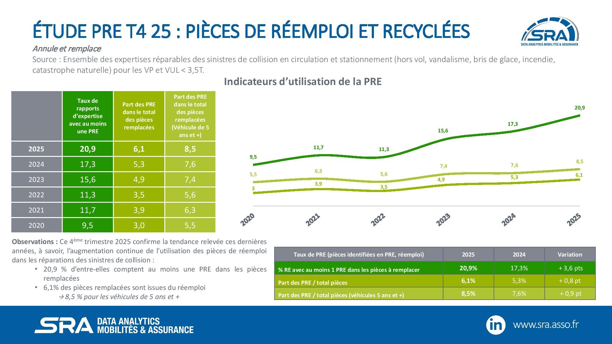 Les chiffres de l'association professionnelle SRA parlent d'eux-mêmes. Au quatrième trimestre 2025, 20,9 % des rapports d'expertise consécutifs à des sinistres de collision ont compté au moins une pièce issue du réemploi. Un bilan qui marque une progression constante depuis 2020, où ce taux plafonnait à 9,5 %.