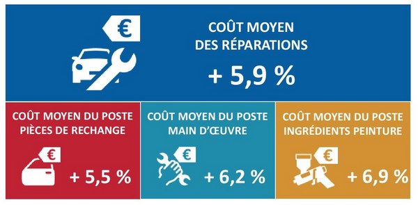 Dans le détail des factures, le poste main-d’œuvre a enregistré l'an dernier une accélération de son évolution annuelle (+6,2 %). Quant au coût horaire moyen des ingrédients peinture, il affiche une hausse marquée (+6,9 %), la plus élevée parmi l’ensemble des composantes.