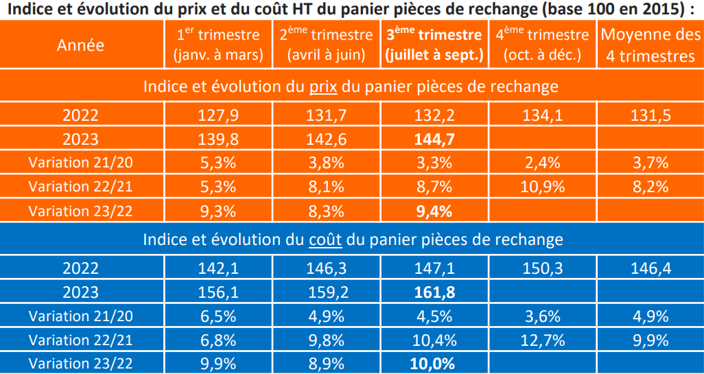 "Après une variation plus contenue durant le 2e trimestre, le prix et le coût du panier pièces SRA augmentent de manière importante et équivalente à la hausse du 1er trimestre. Ces variations s’expliquent par la hausse de tarifs de 15 constructeurs sur les 25 suivis", précise-t-on du côté de SRA.