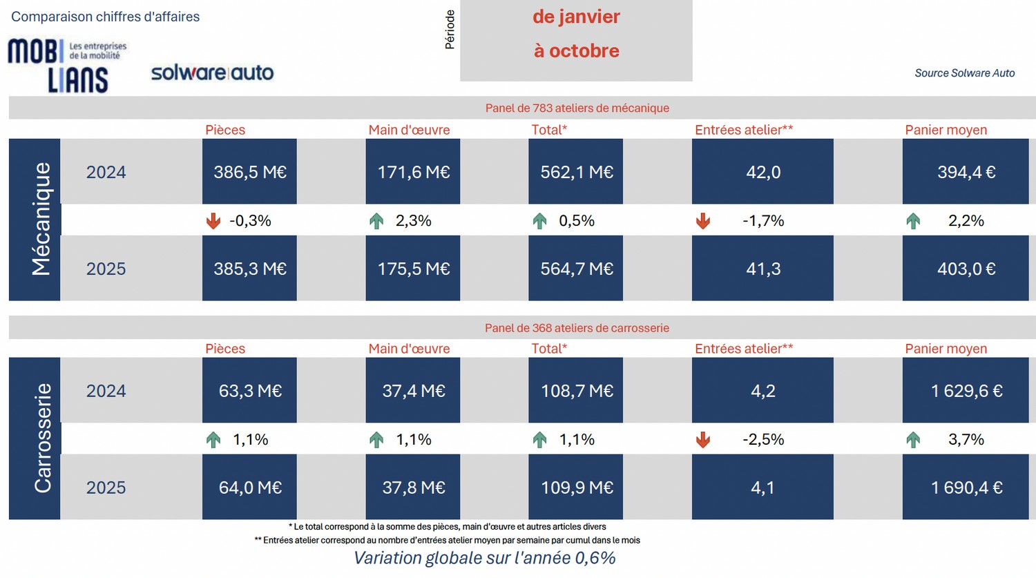 La photographie livrée par Mobilians et Solware dans leur dernier baromètre, établie à partir d’un panel de 1 151 ateliers, met en évidence une réalité désormais familière aux réparateurs automobiles : la fréquentation recule, mais les résultats tiennent. Sur l’ensemble des onze premiers mois de l’année 2025, l’activité progresse de 0,6 %. Une augmentation modeste, mais notable dans un contexte d'érosion des entrées atelier.