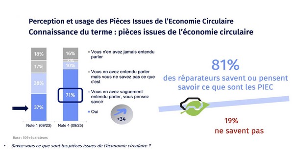 La pièce issue de l’économie circulaire (Piec) gagne du terrain, et pas seulement dans les discours. Le dernier baromètre réalisé par le Gipa pour Mobilians auprès de 509 ateliers représentatifs du marché montre une progression nette de la connaissance du sujet.