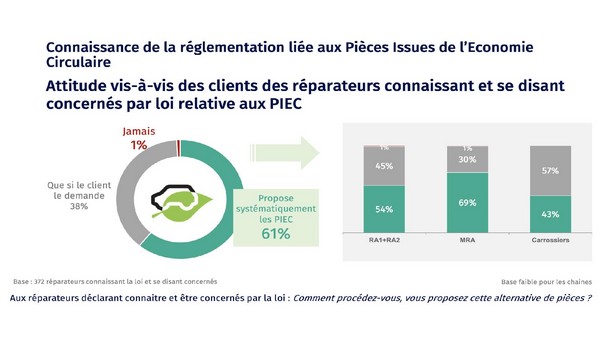 Sur l’aspect réglementaire, la sensibilisation avance également. 78 % des professionnels déclarent connaître l’obligation d’informer systématiquement les clients de l’existence d’une alternative circulaire, depuis l’entrée en vigueur du décret de 2016. Parmi les ateliers concernés, 61 % proposent désormais une Piec en première intention, un taux en nette hausse sur un an. L’adhésion est aussi perceptible côté automobilistes : 74 % d’entre eux acceptent la recommandation du réparateur.