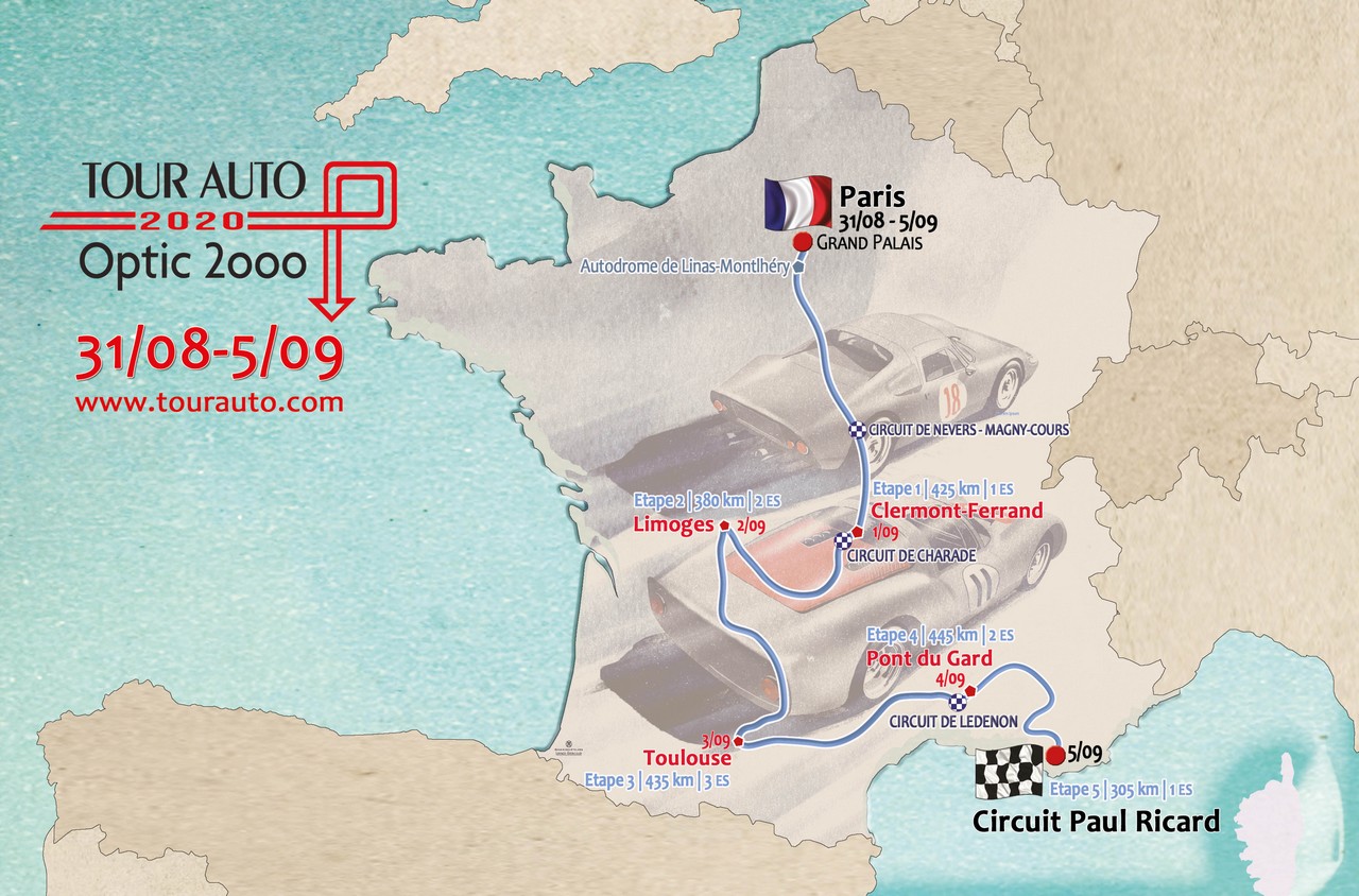 Dès le matin du 1er septembre, les équipages quitteront la capitale pour rejoindre l’Autodrome de Linas-Montlhéry où le départ officiel sera donné. Durant cinq jours, les concurrents se mesureront ensuite sur quatre circuits (Nevers Magny-Cours, Charade, Lédenon et Paul Ricard) et dix épreuves spéciales. Ils auront ainsi parcouru 2140 kilomètres avec pour étapes : Clermont-Ferrand, Limoges, Toulouse et le Pont du Gard avant de franchir la ligne d’arrivée au Circuit Paul Ricard.